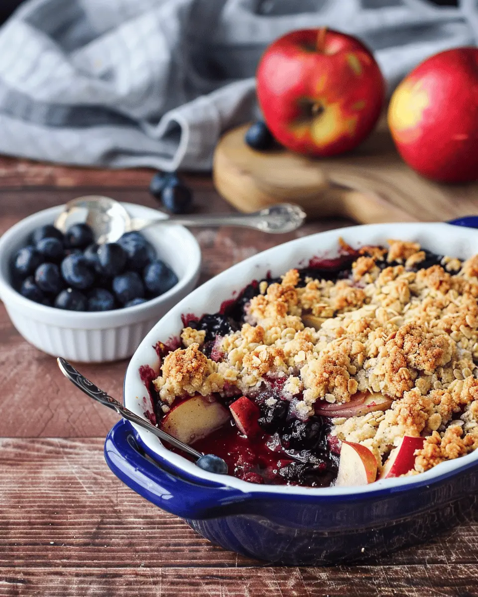A delicious and comforting Apple and Blueberry Crumble recipe that is perfect for dessert.
