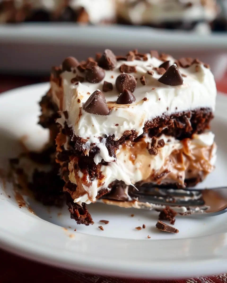 To complete your brownie refrigerator cake, carefully spread a layer of Cool Whip over the top. This delivers a light, fluffy finish that contrasts beautifully with the rich base. Finish with a generous sprinkle of chocolate chips on top for that extra crunch and sweetness.