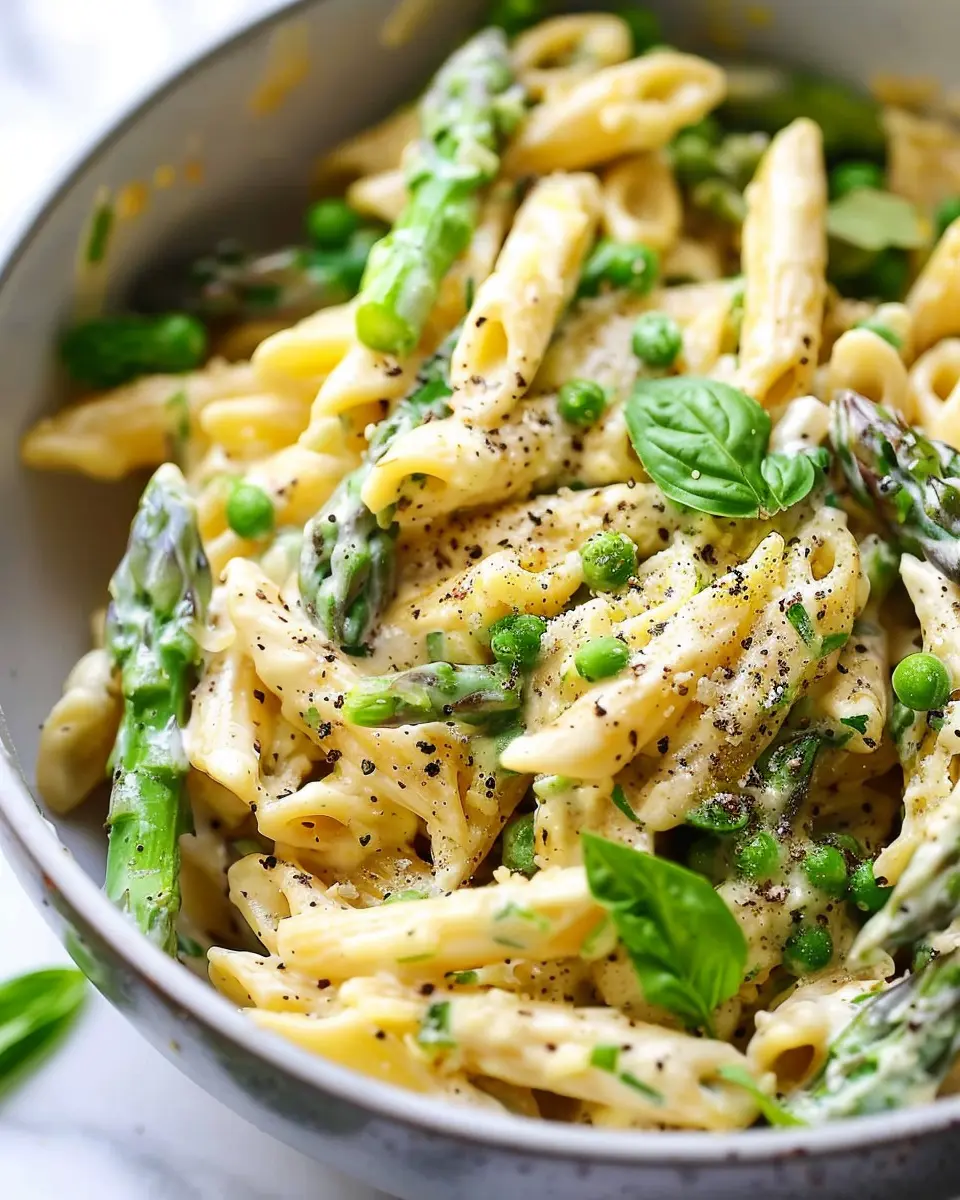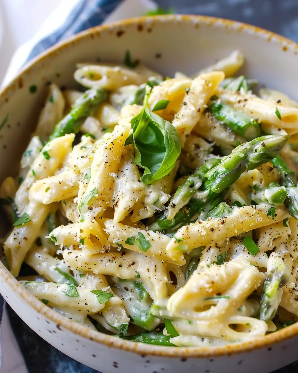 Presentation is key in making your creamy asparagus pasta stand out. Use a large, shallow bowl to showcase the dish elegantly. Twirl the pasta using a fork and spoon to form a lovely nest in the center. Garnish with a sprinkle of grated Parmesan and a few stalks of fresh asparagus arranged artistically on top.