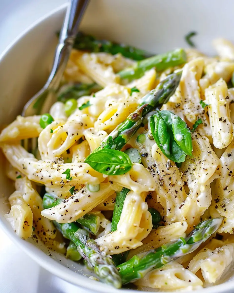 Seasonal Freshness: Asparagus is in season during spring, making it a great nutritional choice. According to the USDA, asparagus is rich in vitamins A, C, E, and K, making it a powerhouse of nutrients that complement the rich creaminess of the pasta. You can learn more about the health benefits of asparagus here.