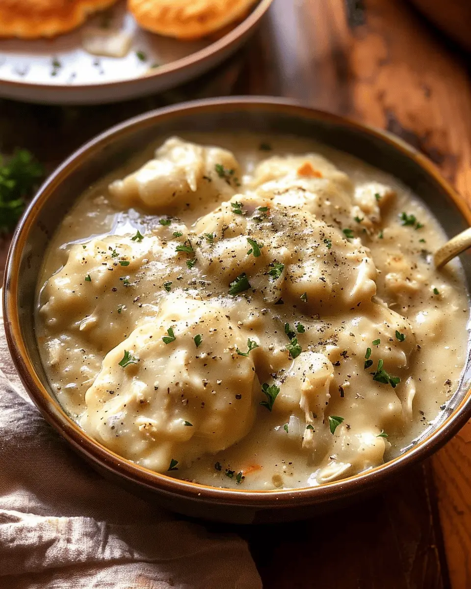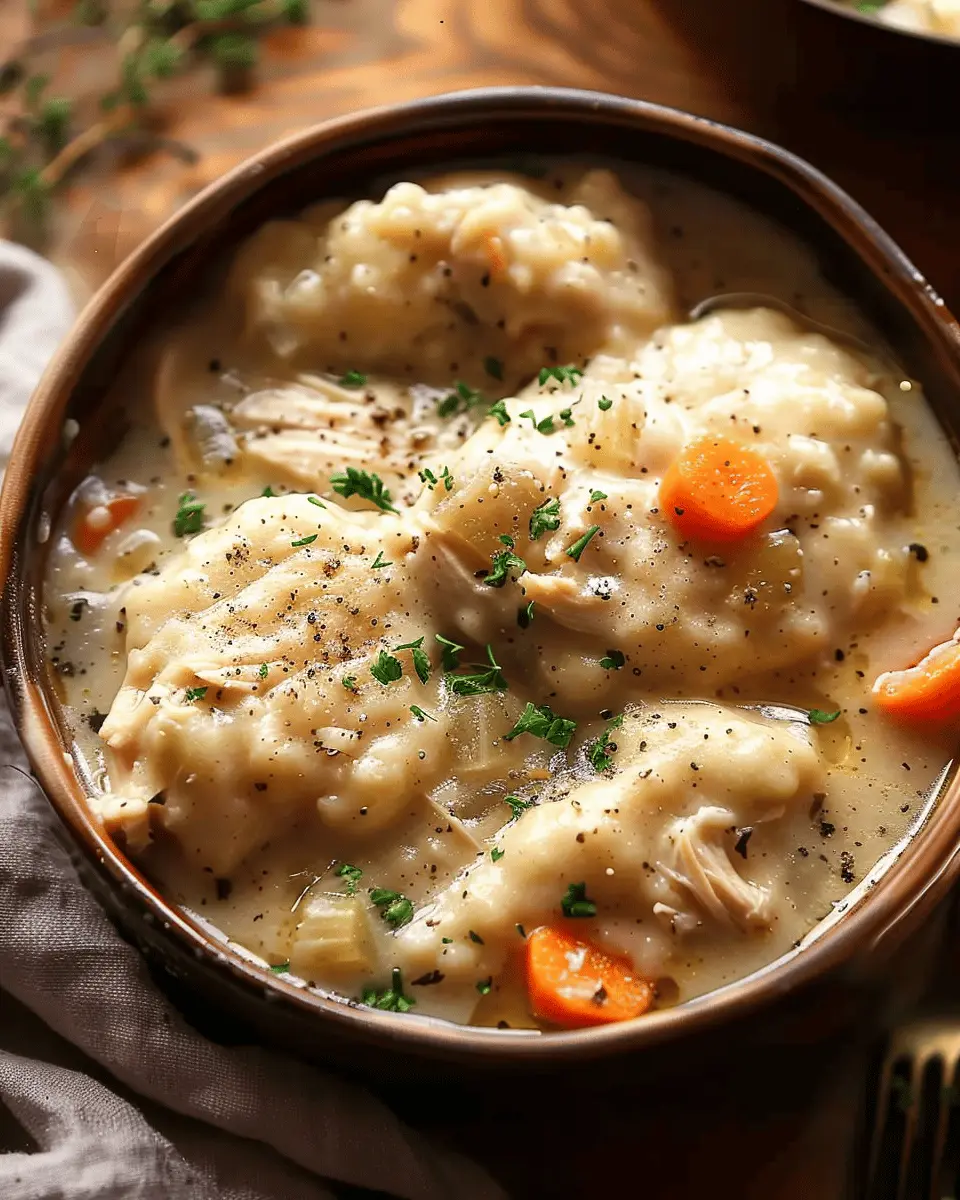 Enjoy a warm and comforting bowl of Crockpot Creamy Chicken and Dumplings, perfect for any family meal.