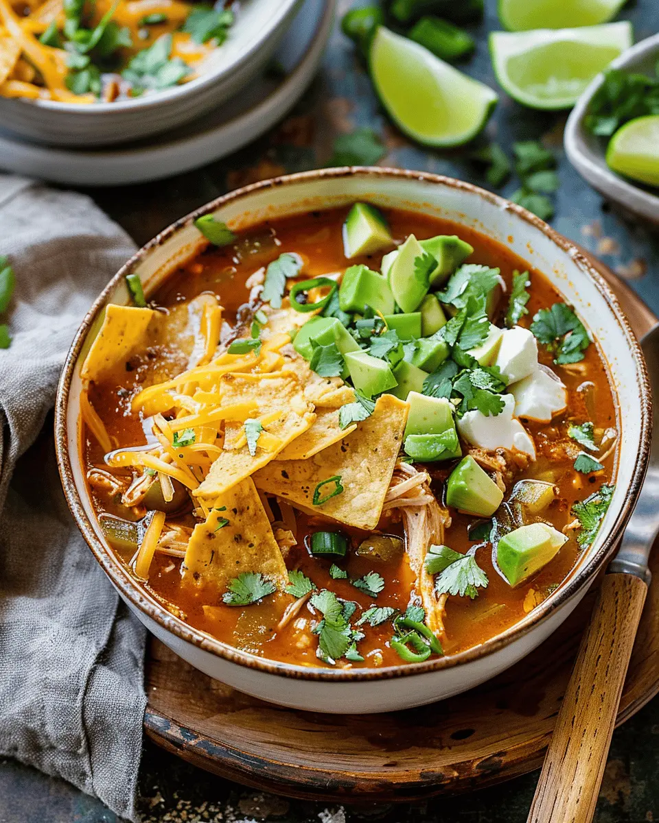 Elevate your crockpot spicy chicken tortilla soup with an array of delicious toppings! A sprinkle of fresh cilantro adds a burst of freshness, while diced avocado brings creaminess that complements the spiciness. Don’t forget crispy tortilla strips for that satisfying crunch!
