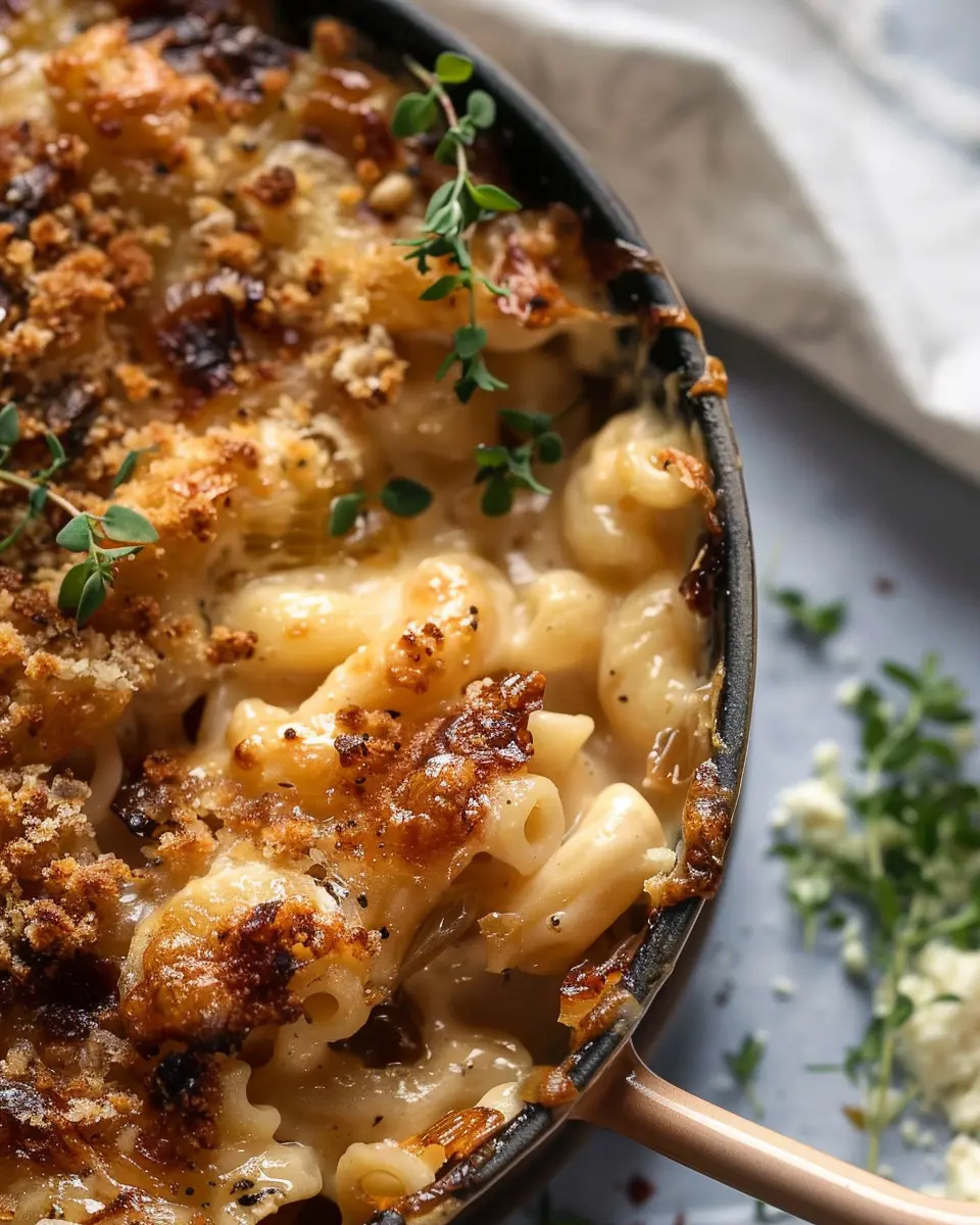 Once out of the oven, let it cool for a couple of minutes (if you can wait!). Serve warm, garnishing with fresh thyme for that final touch. Don’t forget to dig in—you’ll find that this Decadent French Onion Soup Mac & Cheese offers both comfort and culinary delight in every bite!