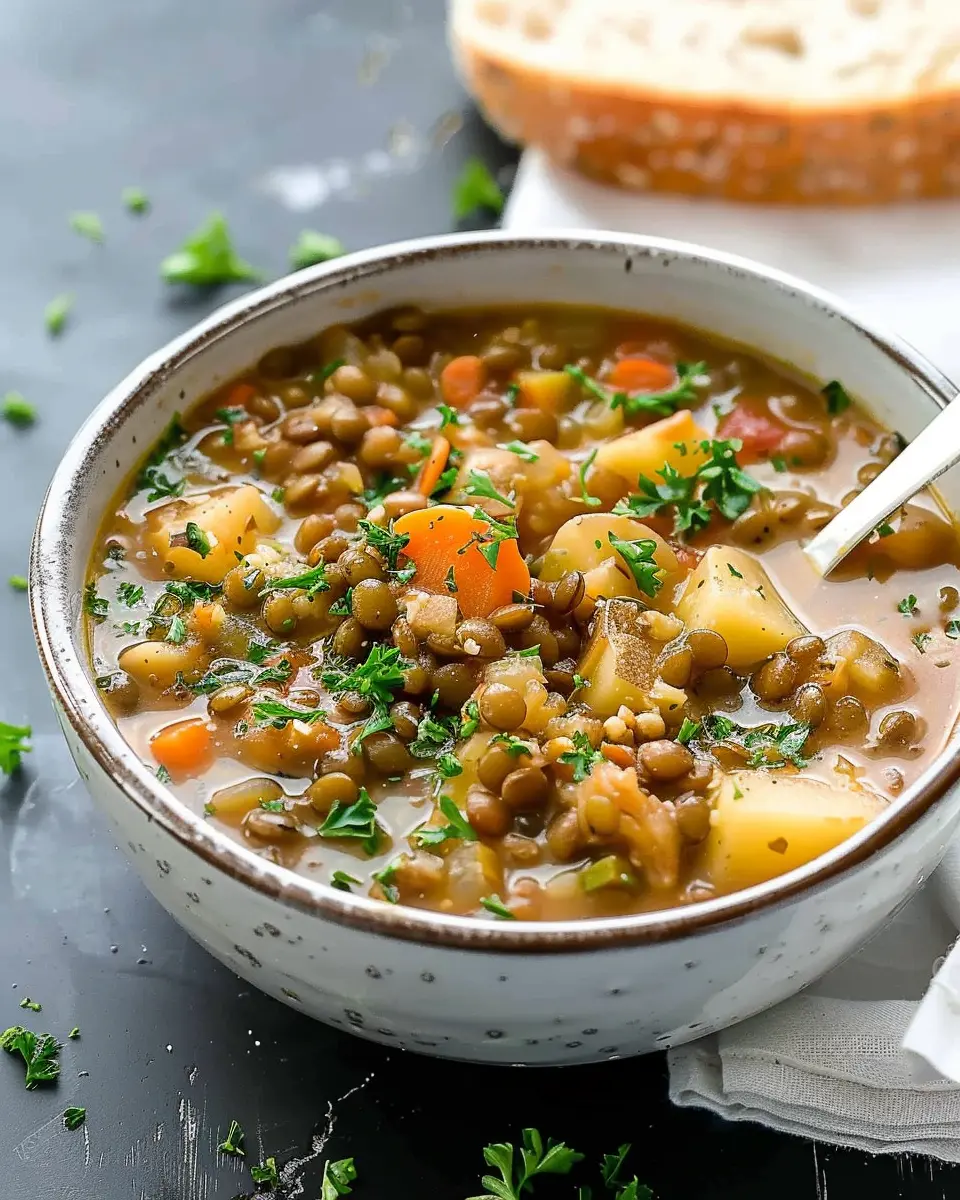 If you’re in the mood to spice things up, try toasting the bread lightly and spreading a bit of garlic butter on top. It adds a layer of flavor that complements the earthy undertones of the lentils and potatoes beautifully.