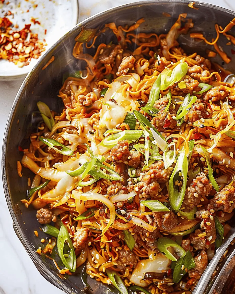 Next, it’s time to pour in your sauces: soy sauce and a drizzle of sesame oil. The key here is to taste and adjust seasonings as needed. This is when the magic of your egg roll in a bowl comes to life! For a bit of heat, sprinkle in some red pepper flakes.
