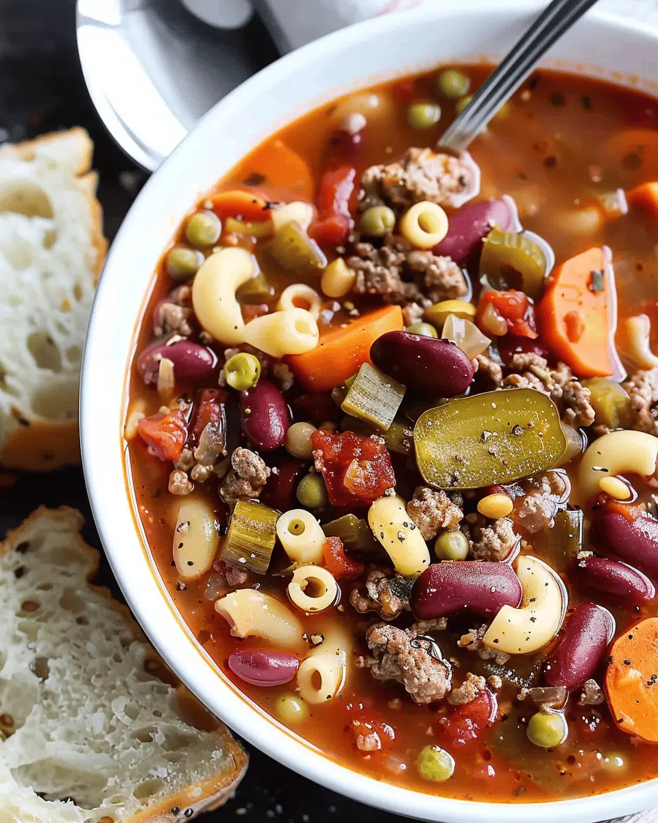 A warm and comforting hamburger minestrone soup, perfect for chilly evenings.