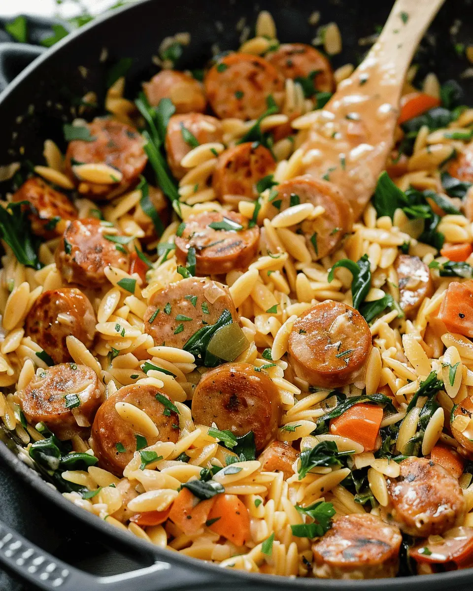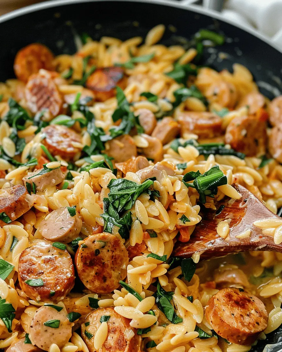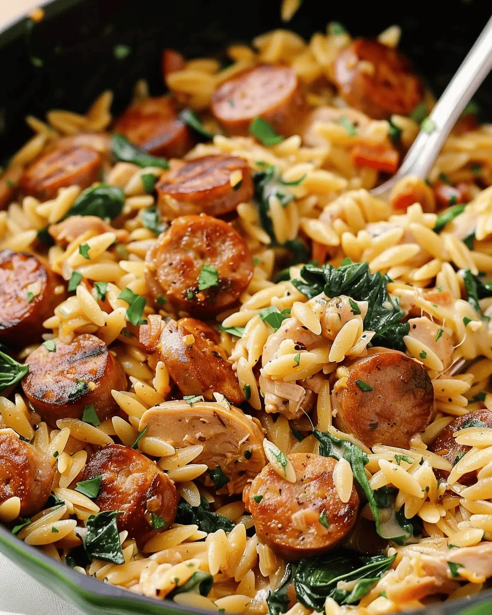 PrintIrresistible Creamy Chicken Sausage Orzo Skillet: A Quick and Easy Delight