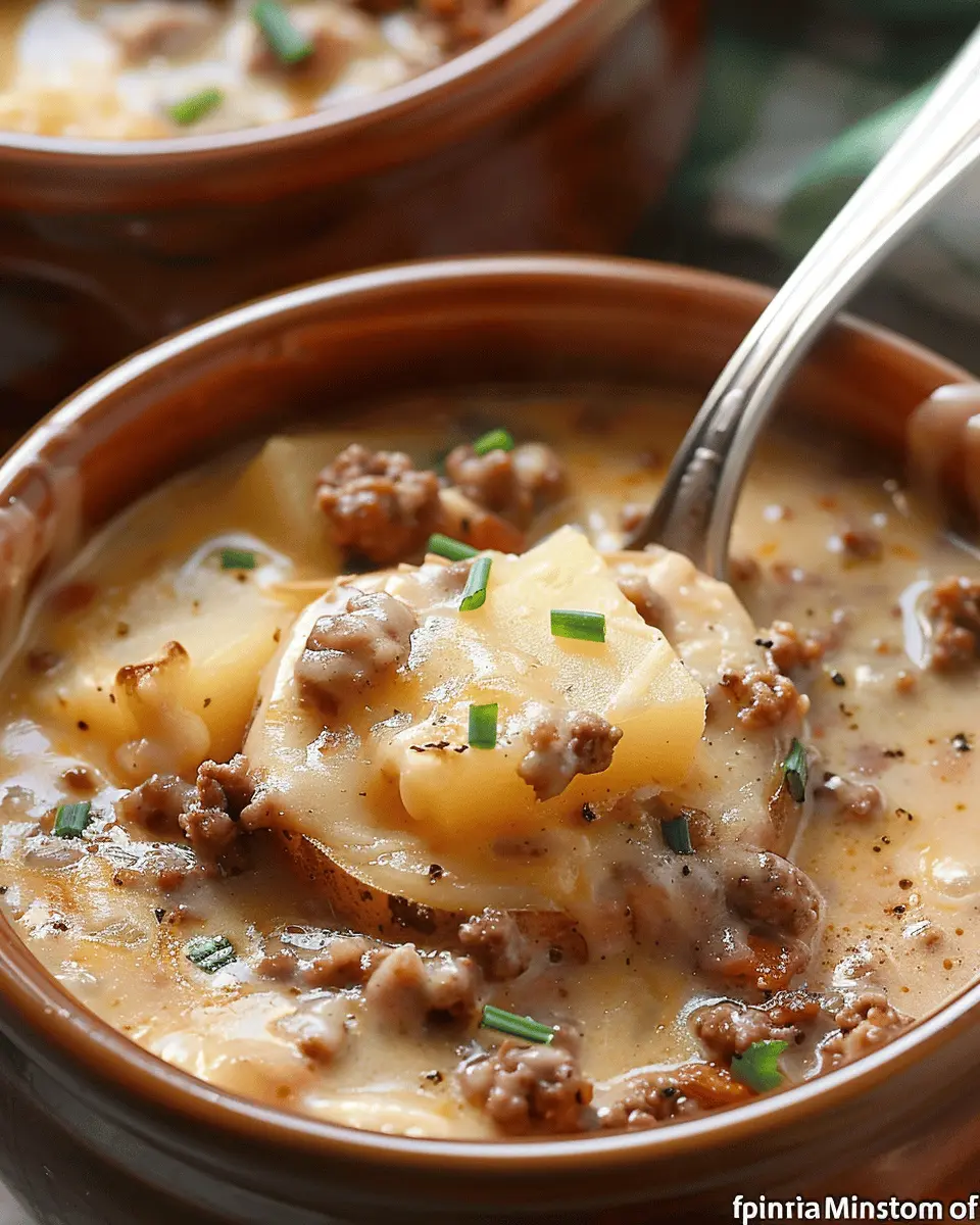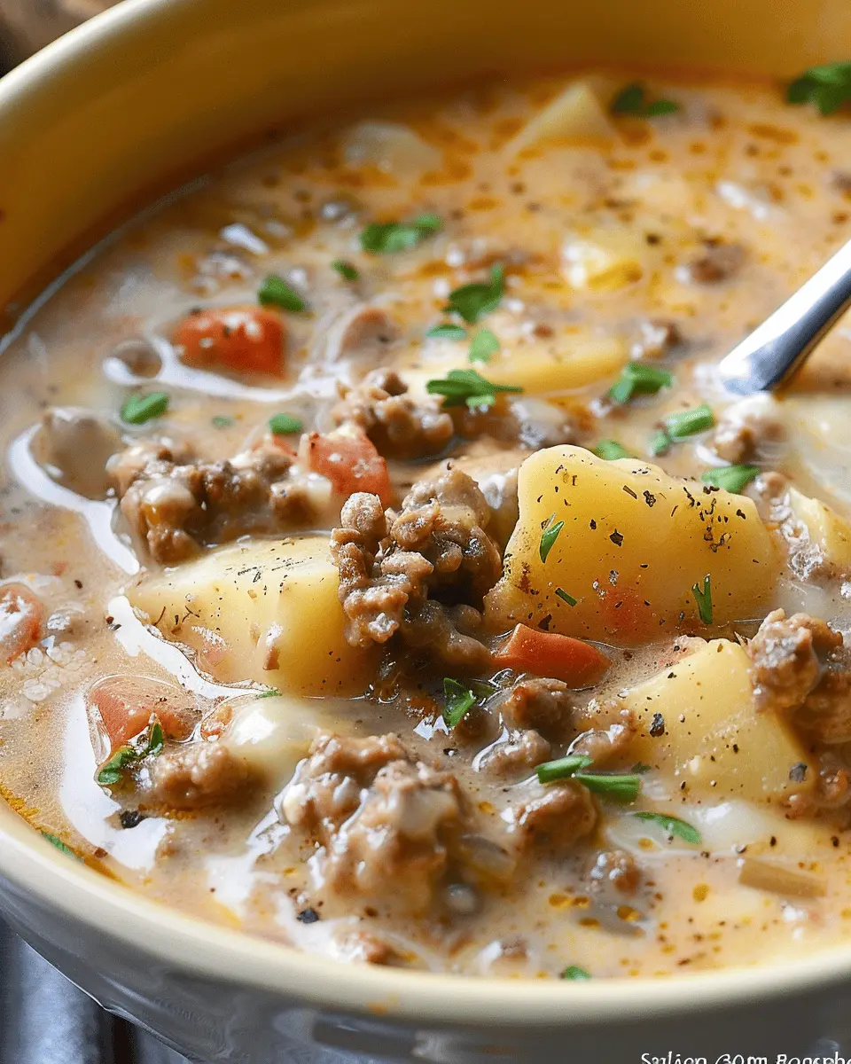 Indulge in the creamy and hearty Loaded Baked Potato Hamburger Soup that combines classic flavors in a comforting bowl.