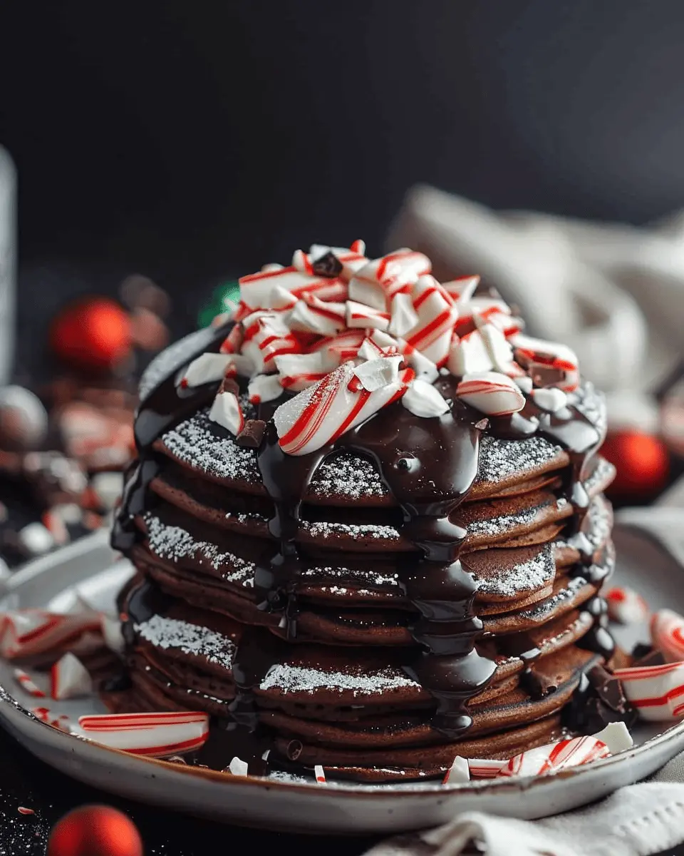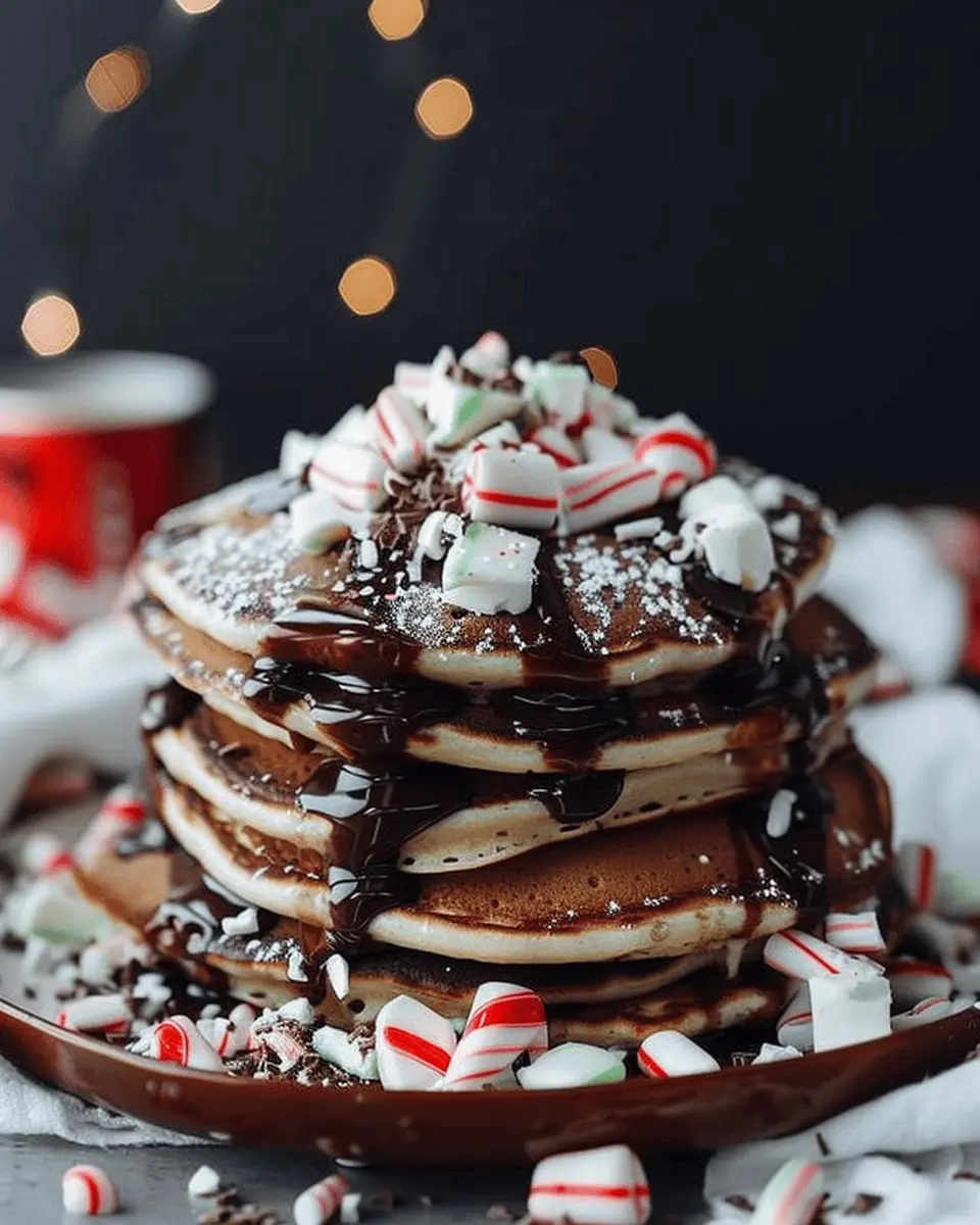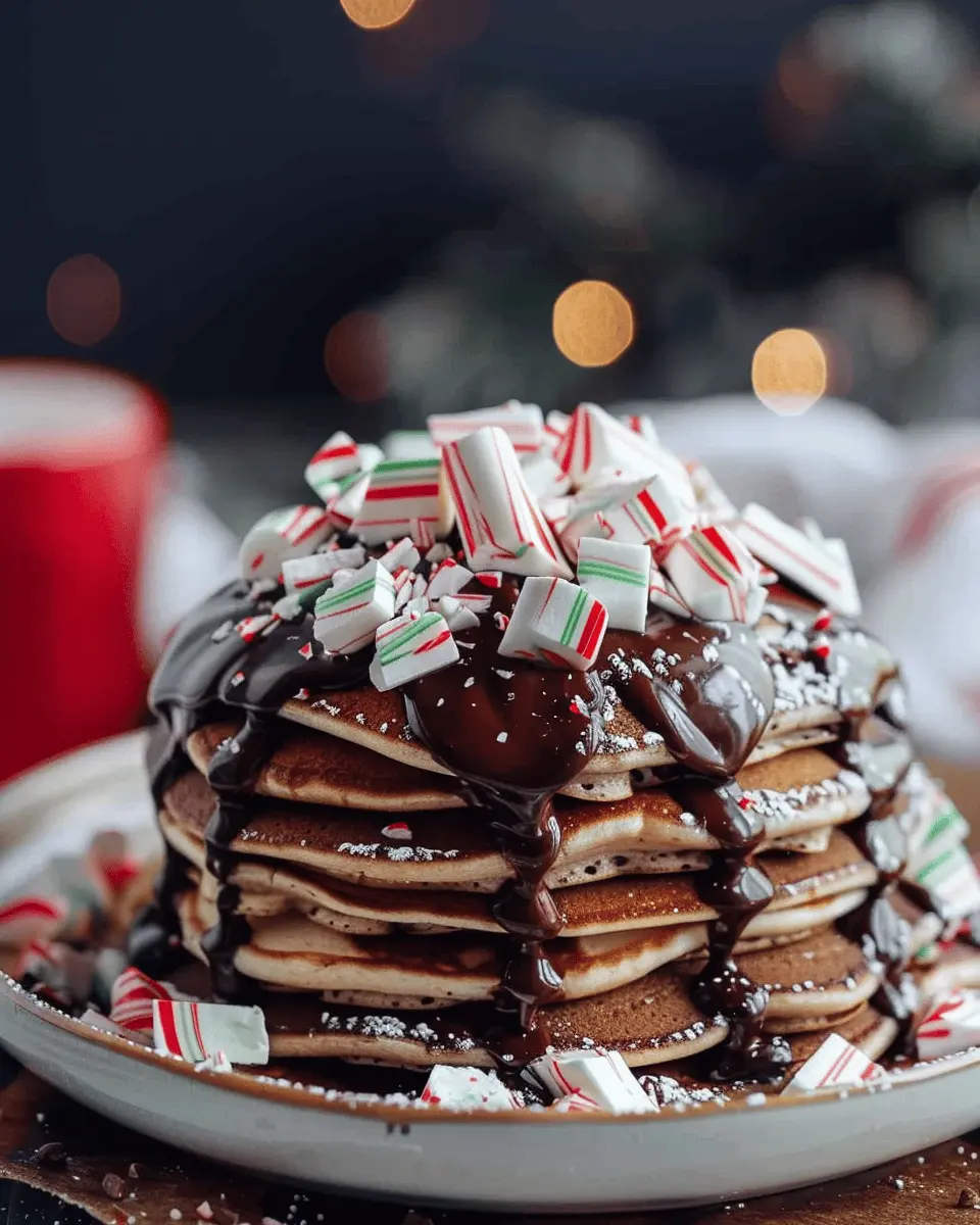 Indulge in the festive flavors of peppermint and chocolate with these delightful pancakes, perfect for a holiday breakfast.