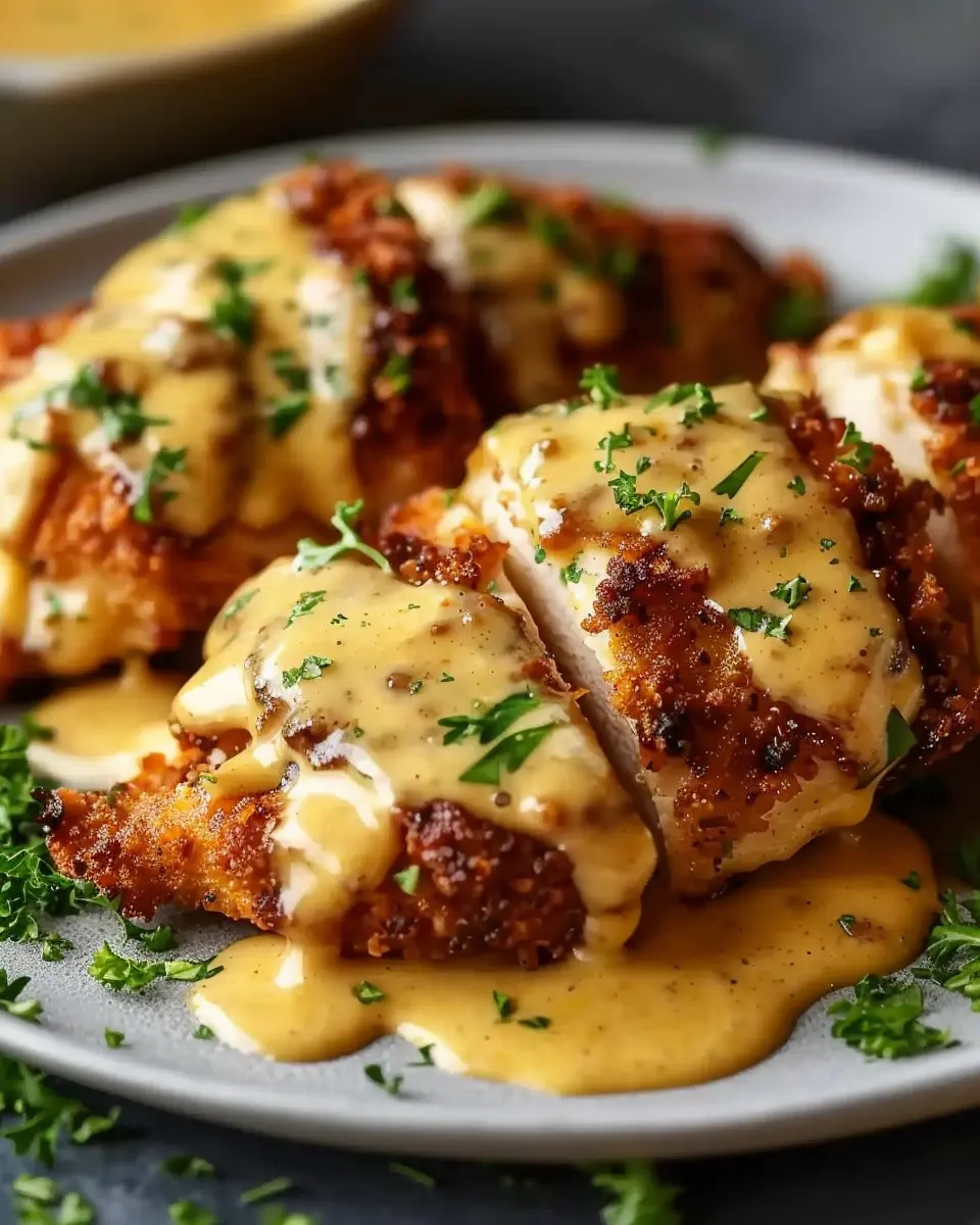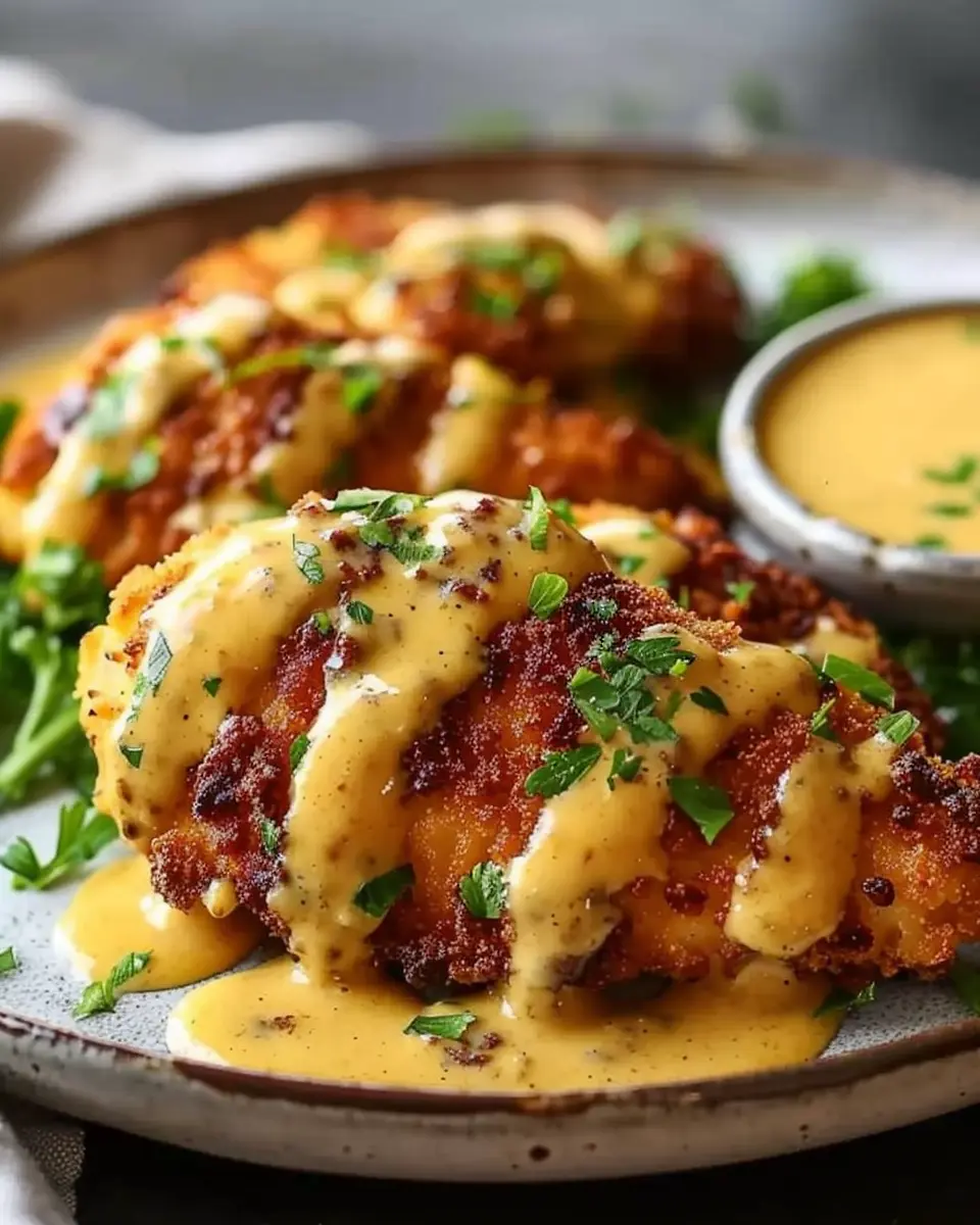 Now that your delicious Pretzel Chicken and Mustard-Cheddar Sauce are ready, it’s time for the best part—serving! Pair your chicken with a side of fresh greens or classic fries for a complete meal. Don’t forget to garnish with a sprinkle of chopped parsley for a touch of freshness.