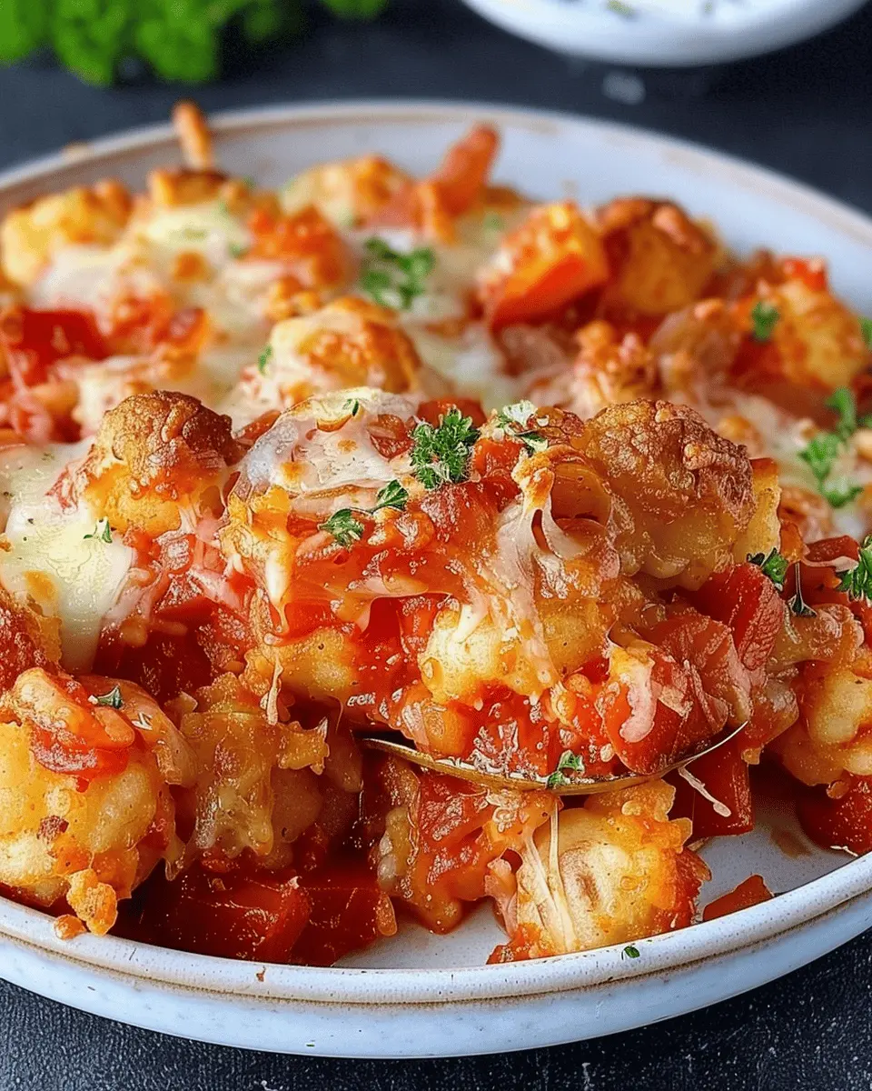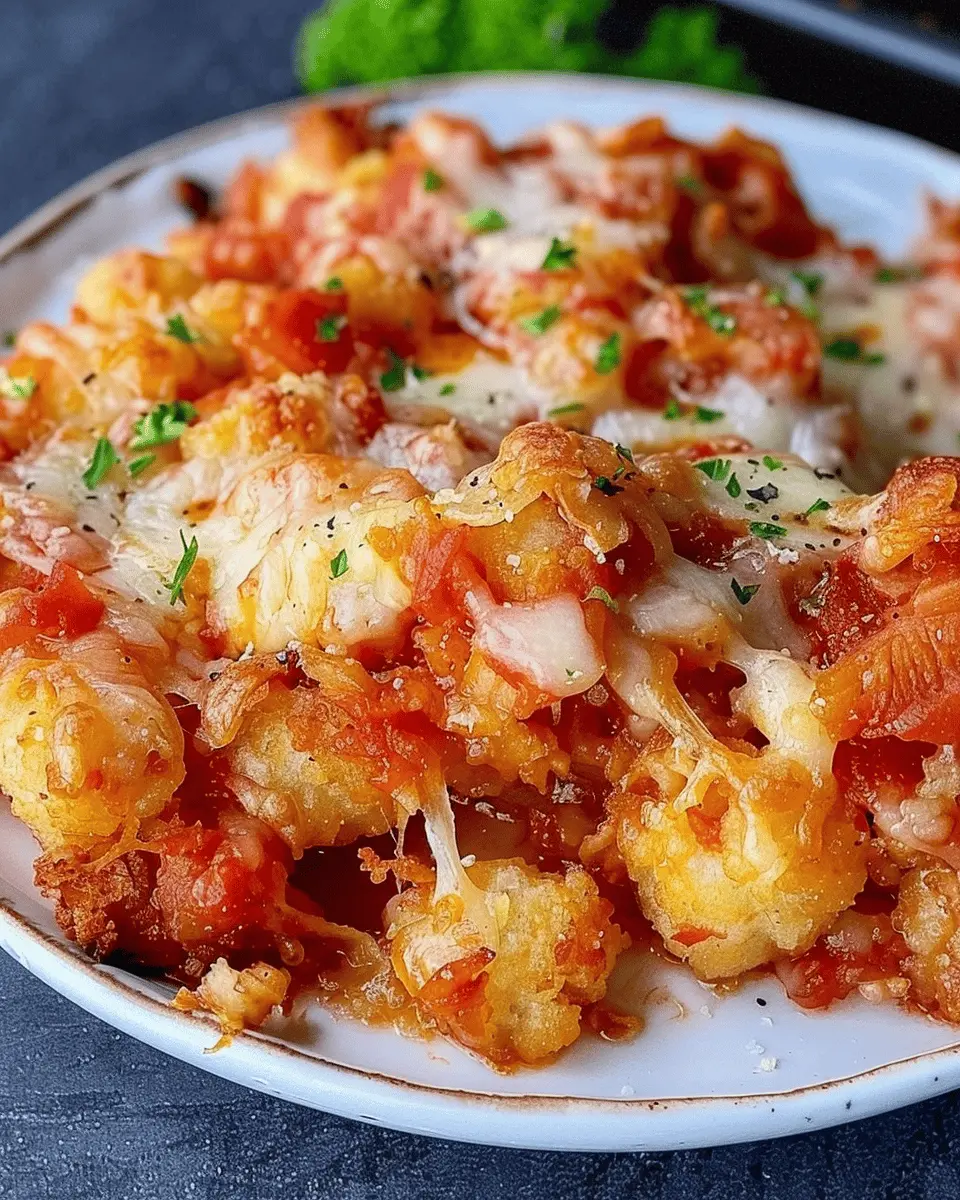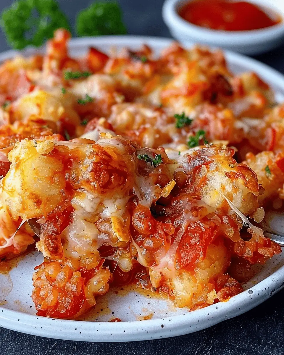 Keywords: Tater Tot Pizza Bake, comfort food, family-friendly, cheesy, crispy
