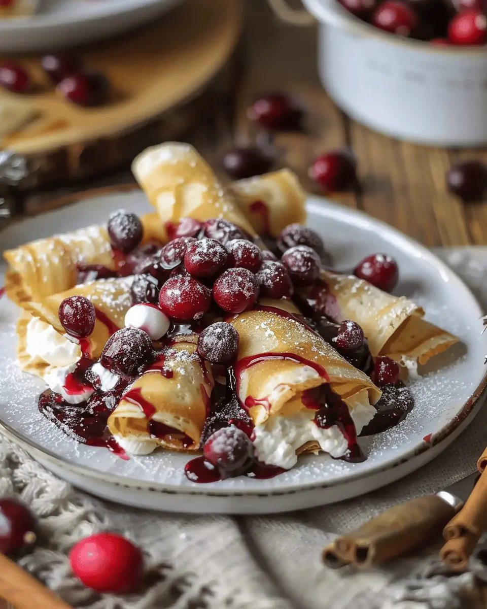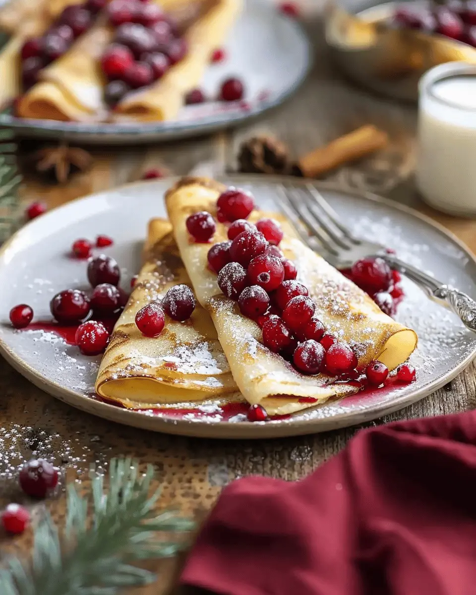 No festive brunch is complete without a perfect beverage pairing! For an inviting touch, serve these delightful crepes alongside a warm spiced apple cider or a refreshing peppermint hot chocolate. Both options complement the tartness of the cranberries while bringing that cozy holiday spirit to your table.